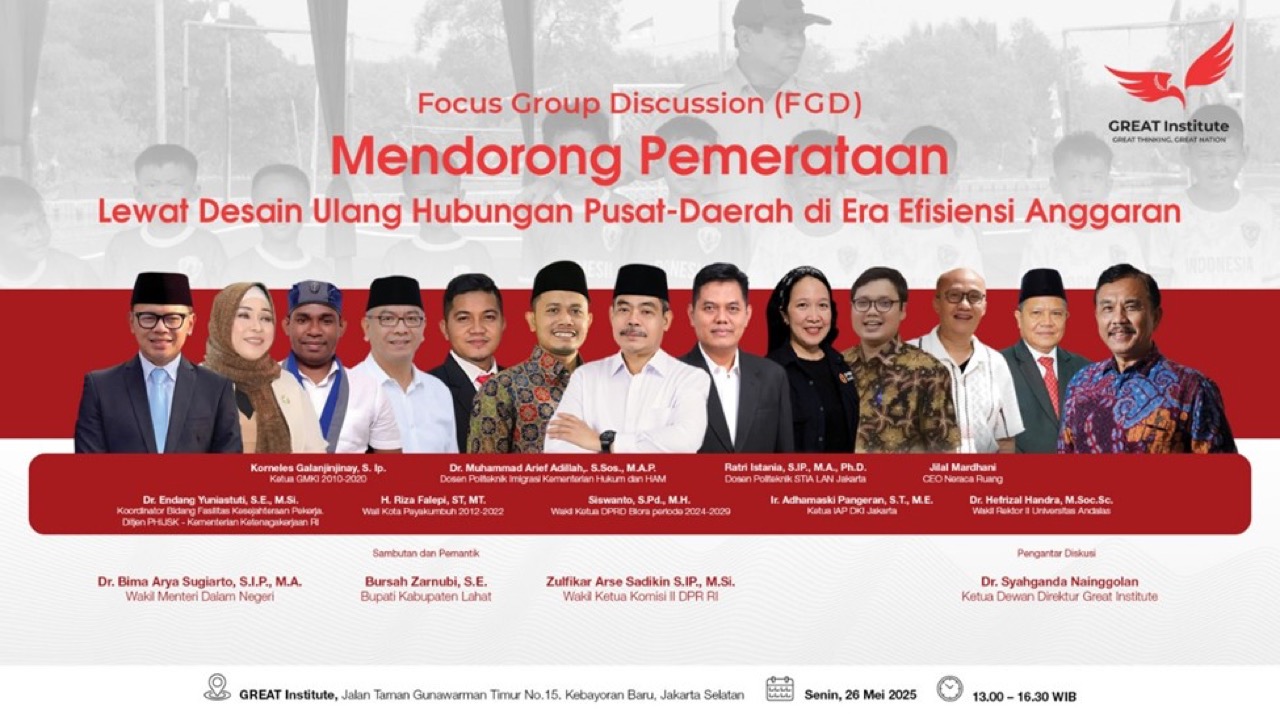 Otonomi daerah hari ini bukanlah kebebasan, tetapi tarik-ulur kekuasaan antara pusat dan daerah. Begitulah kesimpulan samar namun menggigit dari Focus Group Discussion yang diselenggarakan GREAT Institute, bertajuk \”Mendorong Pemerataan Lewat Desain Ulang Hubungan Pusat-Daerah di Era Efisiensi Anggaran.